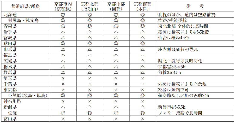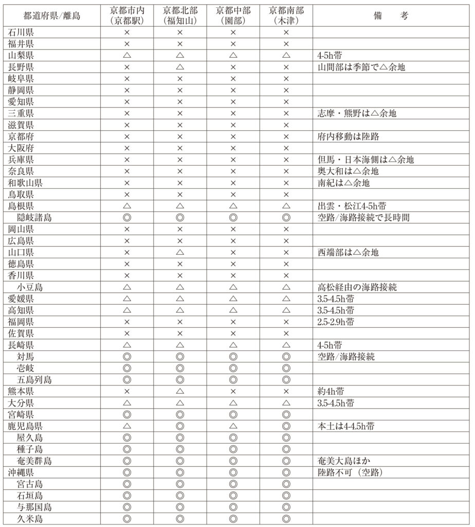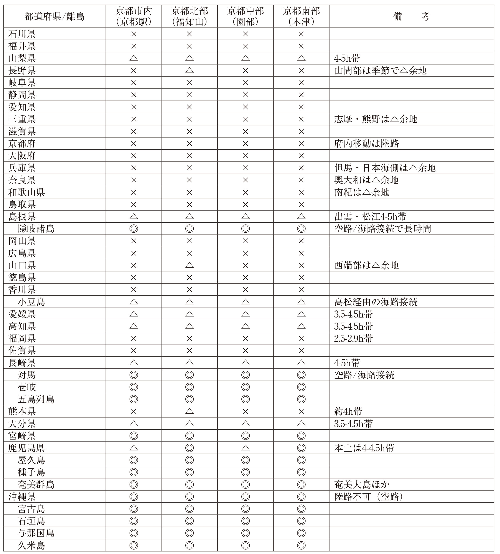 ◎:おおむね6時間以上又は離島で海/空路接続により著しく長時間