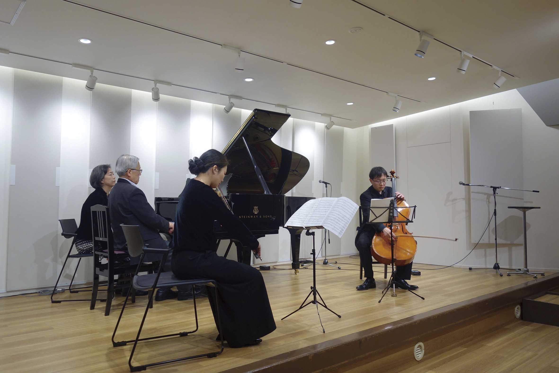そして最後のステージは、深尾憲一会員、山崎悠会員、藤川幸さん(弁護士会職員)のユニットによるピアノ三重奏(ピアノ、チェロ、ヴァイオリン)でした。メンデルスゾーン作曲による「ピアノ三重奏曲第1番」の第1楽章と、ピアソラ作曲による「オブリビオン」(ピアノ三重奏曲版)を披露されました。深尾憲一会員のグレースフルなピアノの音色に、山崎会員のチェロと藤川さんのヴァイオリンの音色が溶け込むように協奏している空間は、ステレオから流れてくるクラシックレコードの鳴り響く時間そのもののようでした(映画「砂の器」に流れる「宿命」を聴いている時のような思いが湧き起こりました。)。違ったのは、その音が今すぐそこ、自分の目の前の演者が奏でる楽器からダイレクトに響いていることでした。自分にとっての弦楽協奏曲としてはビートルズの「イエスタデイ」が一番に浮かぶのですが、もの悲しい響きのそれとは違う、まさにグレースフルな弦楽音を心行くまで味合わせていただきました。