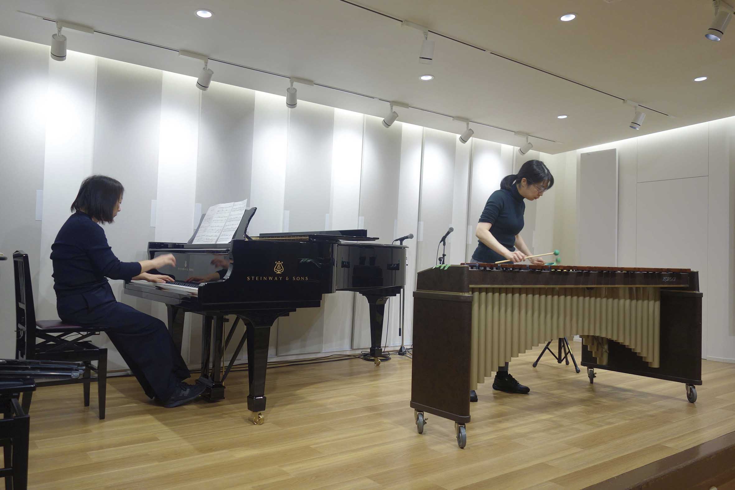 第1ステージは、谷岡茉耶会員のマリンバと大阪高裁の中川綾子判事のピアノの協奏でした。一柳慧さん作曲の「パガニーニ・パーソナル マリンバとピアノのための」が披露されました。谷岡会員は、多数の鍵盤を、複数種類のマレットを巧みに使い分けながら中川判事のピアノの旋律と一体となって演奏され、ホールは激しい情感に包まれました。マリンバの曲は、ローリングストーンズの「アンダーマイサム」しか聴いたことのなかった私には、「マリンバとはとげのある曲を優しく和らげるように演奏されるもの」という勝手な固定観念があったのですが、谷岡会員の激しい演奏を鑑賞し、初めて本格的なマリンバ演奏を味わえたような気がしました。「次回は、アンダーマイサムで私も共演させて頂きたいな。」とおこがましいことを考えてしまいました(笑)。
