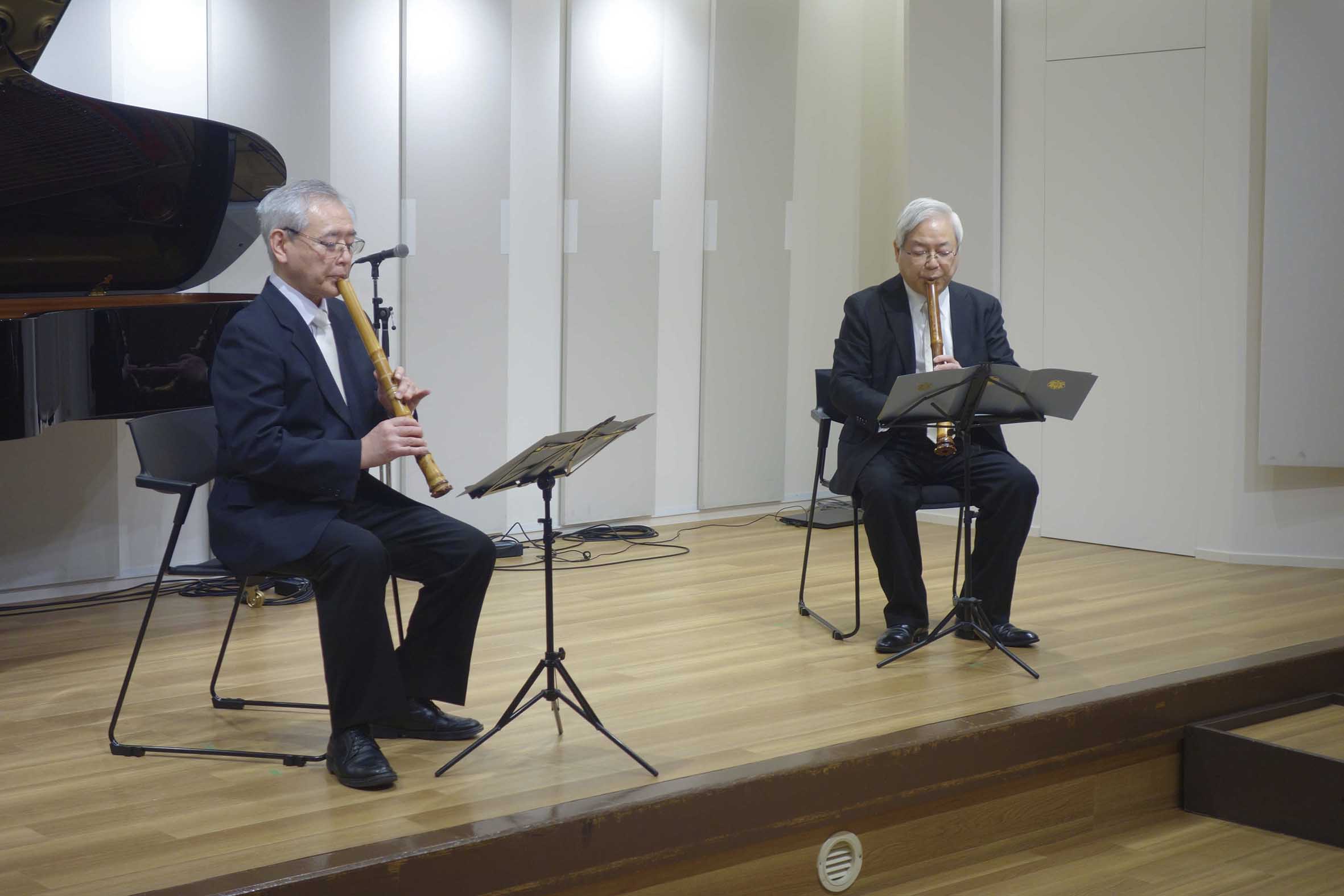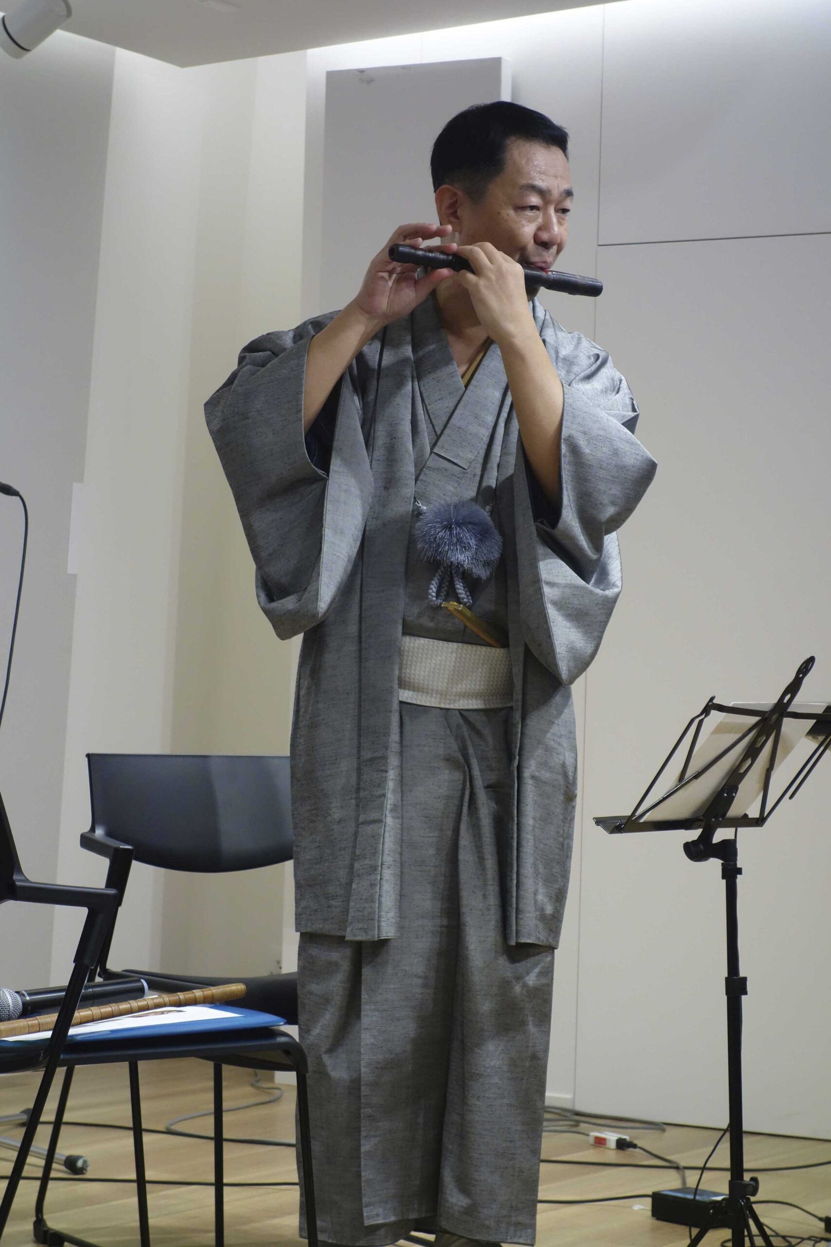 第6ステージは、この間、新役員披露宴等で祇園囃子を披露されてきた小町崇幸会員のご登場。いつもの囃子方構成ではなく、笛(能管、篠笛)のソロを披露されました。この日は、小町会員のお師匠様が前日にお亡くなりになり、追悼の演奏ともなりました。祇園囃子、長唄、江戸囃子、童謡などを取りそろえての、京都らしい空間が展開された時間となりました。ホテルの広間ではやや拡散気味となってしまう音が、旭堂楽器店のホールという環境の中でとてもよく、かつダイナミックに耳に届き、祇園囃子の生演奏を初めて味わえたような気がしました。小町会員の指が滑らかに、優雅に、かつ素早く動き続ける様子をかぶりつきで観ることができたのは、この企画のスタッフならではのこと、と感謝の思いが湧き起こりました。「8時だよ、全員集合!」視聴世代の私にはツボである、東村山音頭のご披露もありました(笑)。今度は小町会員が祇園祭で演奏されるのを鑑賞してみたいと思いました。