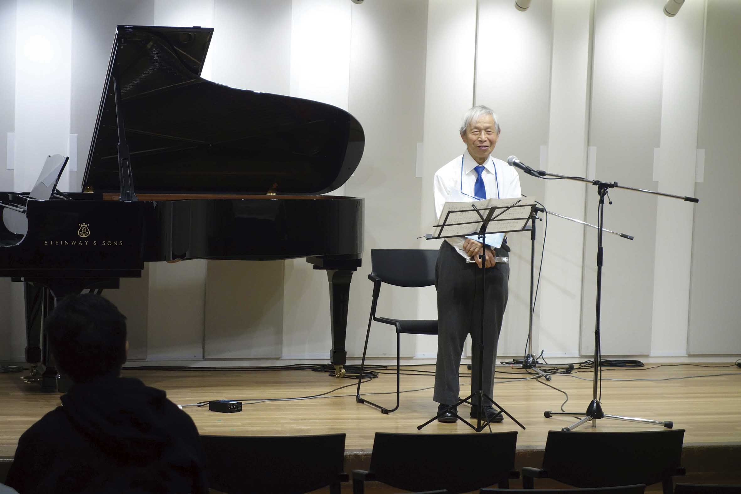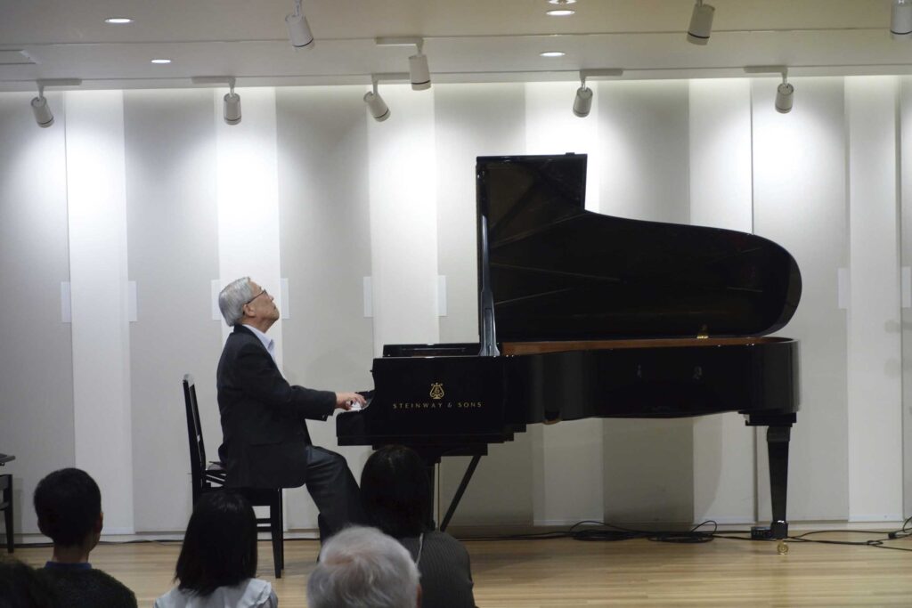 途中、心温まる、複数の会員の方からの差し入れお菓子を楽しむブレイクタイムを挟んで、第5ステージの場面を迎えました。登場されたのは、小町崇幸会員のお嬢さんの小町彩華さん(9歳)。ピアノで「ロンドン橋」「しりとり」「森のはる」「パフ魔法の竜」を披露してくれました。「がんばって、ミスをせず、きれいに最後までひきたいです。」とおっしゃっていましたが、大人の心を和らげてくれるピアノの音色を丁寧に披露してくれました。ステージに用意されたスタンウェイのピアノに「こんなすごいピアノを弾かせてもらえるの?!」と目を輝かせて楽しんでいただけたようです。会員のご家族にもこのような機会を実現できて、企画者冥利に尽きる思いをさせていただきました。次回もまた是非ご参加いただきたいと思います。